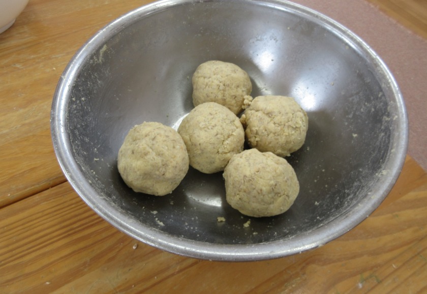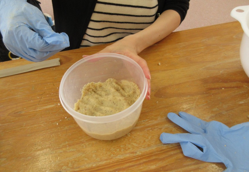 茹でた大豆をジップロックに入れてつぶし、次に米麹と麦麹をよーく混ぜ合わせます。きれいに混ぜ合わせた後に塩を加えてまたよーく混ぜ合わせます。そこへつぶした大豆と大豆の煮汁を少しずつ加えて耳たぶぐらいの固さになるまでよくこねます。よく混ぜ合わせたら消毒をしたタッパーへ空気が入らないように詰めていきます。
