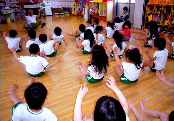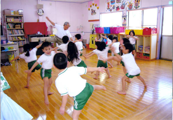 今年度はじめての体育教室でした。とんだり走ったり、手足を伸ばしたり、まげたりと沢山身体を動かしました。