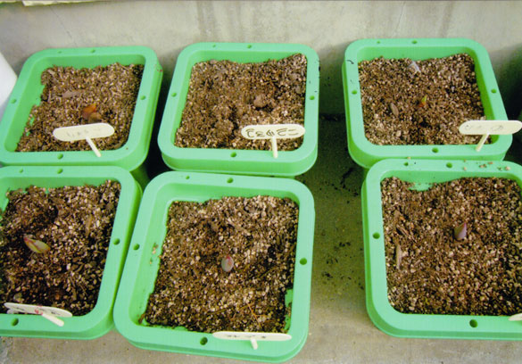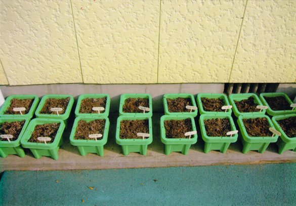 5歳児さんが植えたチューリップの芽が寒い中出てきました。