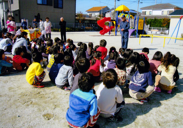 非常ベルがなると、いつものように落ちついて避難できました。その後の消防自動車や救急車の見学も「すごいねー」と言いながら真剣に見ている子どもたちでした。