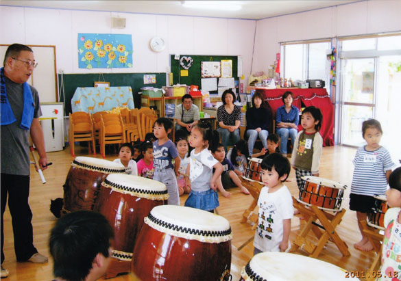 父母の会役員さんが一日保育園ですごして下さいました。ちょうど和太鼓の練習の日だったのでお父さん、お母さんも太鼓をたたいてもらいました。いい経験でしたね。