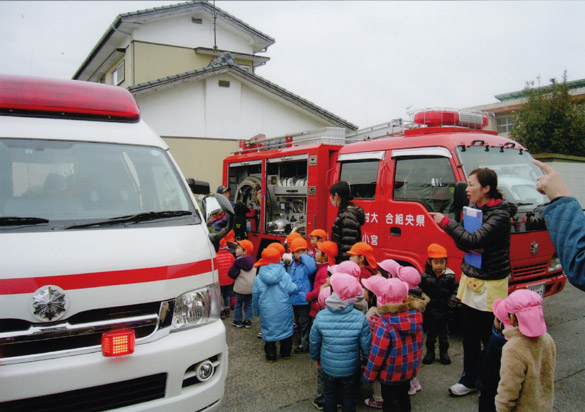 消防自動車や救急車の見学を行い腹話術のけんちゃんと「火遊びは絶対にしません」と約束しました。