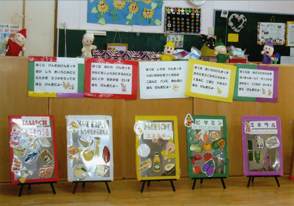 食べ物には一つ一つ人間に必要な栄養があってそれをバランスよく食べることが大切なんだよ。というお勉強です。人形劇で楽しく教えてくださいます。