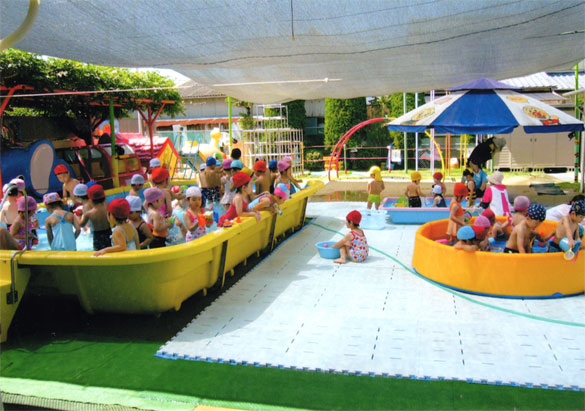 あまりの天気の良さに、遮光ネットをはりめぐらせて快適なプールあそびです。