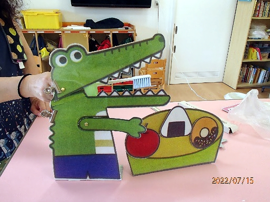 先生の出し物ではワニさんが虫歯になるお話しで、食べた後は歯みがきをしましょう。