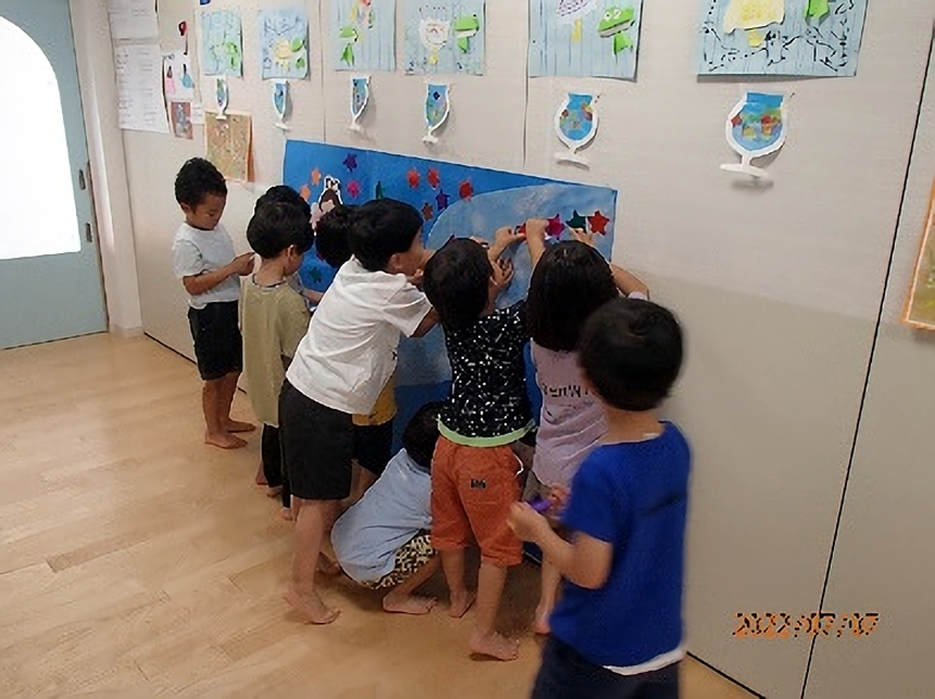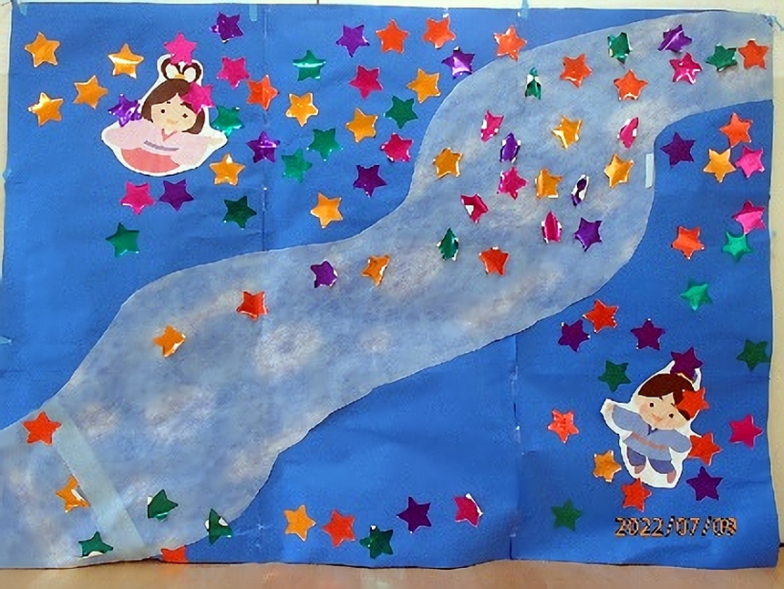 お話しの後は、みんなで星のシールを貼って天の川を完成させました。