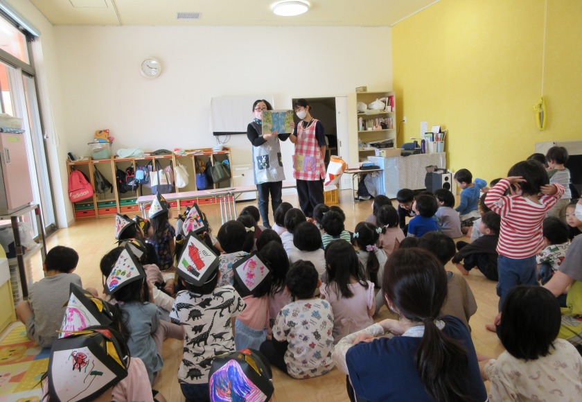 紙芝居を見たり、各クラスで作ったこいのぼりを見せ合いっこをしたり、