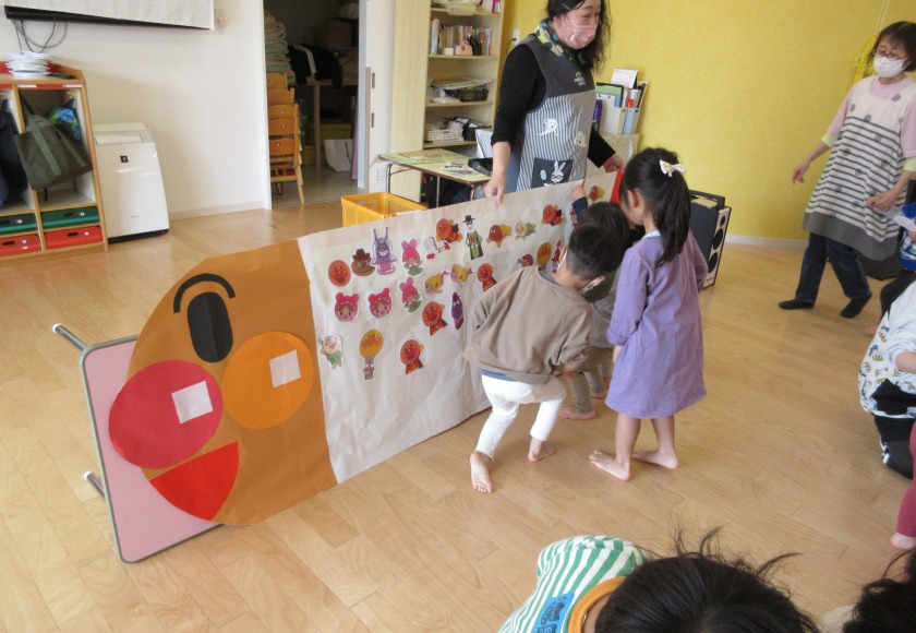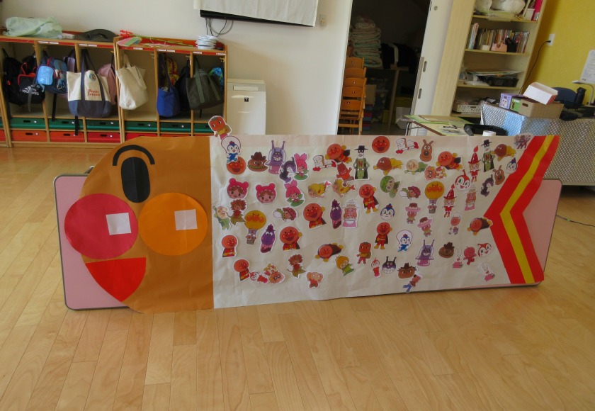 大きなアンパンマンのこいのぼりに、みんなでシールを貼って完成させたりと