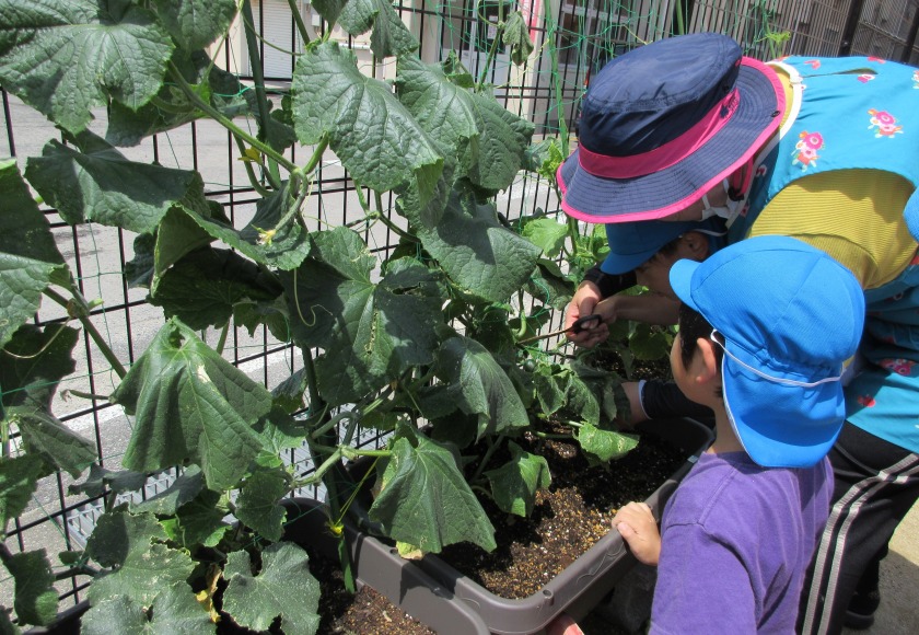葉っぱの裏に隠れてぐんぐん成長し、今日子ども達と一緒に収穫しました。