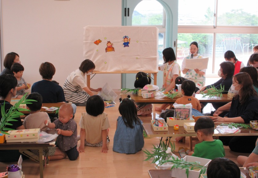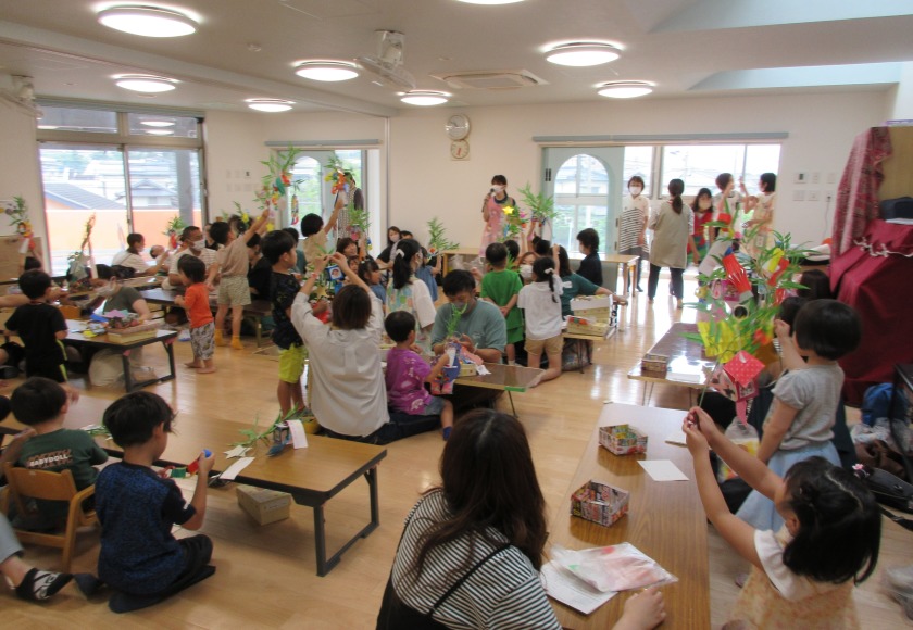 今年は久しぶりに七夕まつりが開催されました。何日も前から子ども達は「たなばた楽しみ」と毎日のように言っていました。当日は雨で開催ができるか心配でしたが、子どもたちの願いが届き無事に開催することができました。親子で一緒に笹飾りを作って短冊にいろいろなお願いごとをかきました。制作の後は、一緒に給食を食べ、とても嬉しそうな子ども達でした。とても素敵な1日になりました。