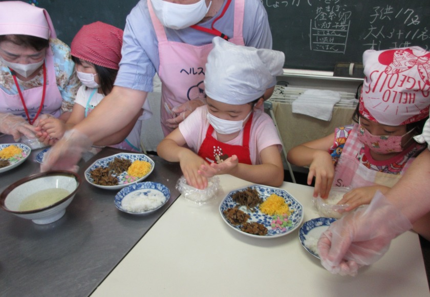 牛乳パックを用いて押しをして出来上がりました。子ども達は自分のお寿司を食改さん達に教えてもらいながら楽しそうに詰めていました。つきあげ作りでは、自分たちで小さく丸めそれを平らにしてホットプレートの上で焼いていきました。焼き目がついてきて、いい匂いがしてくると、「おなかすいた~」「早くたべた~い」と待っていたこどもたちでした。
