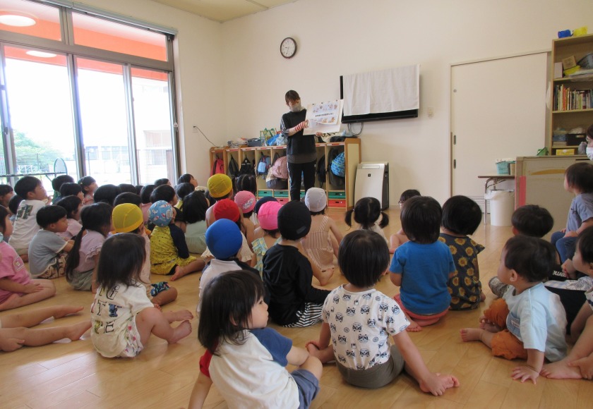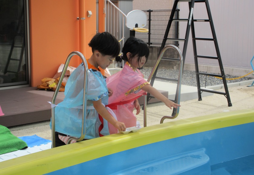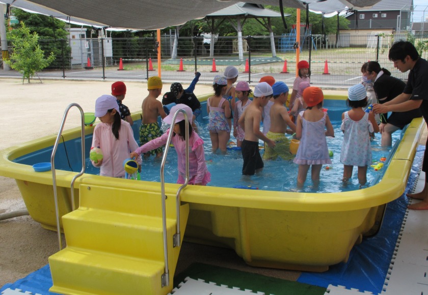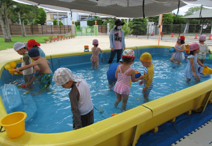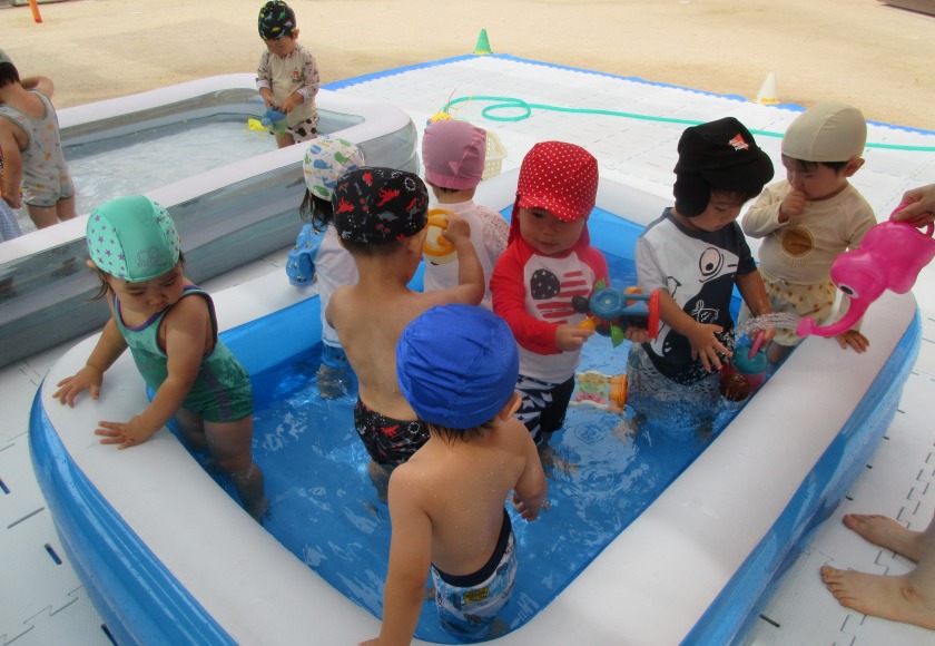 小さなプールを出しました。始めにみんなで、プールでのお約束事をし、