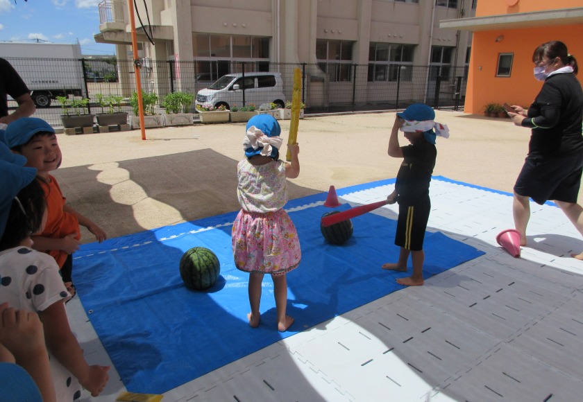 プールの後は、3・4・5歳児のお友達で、スイカわり大会をしました。