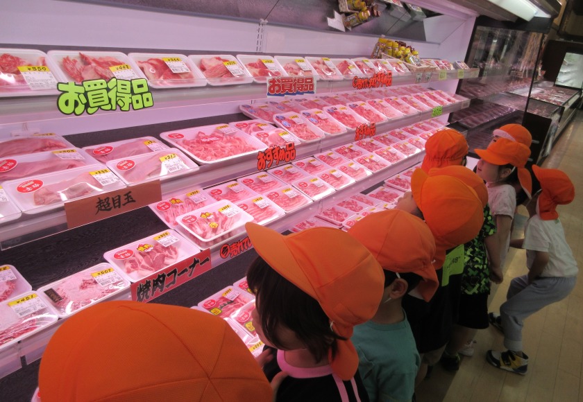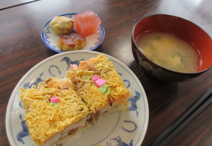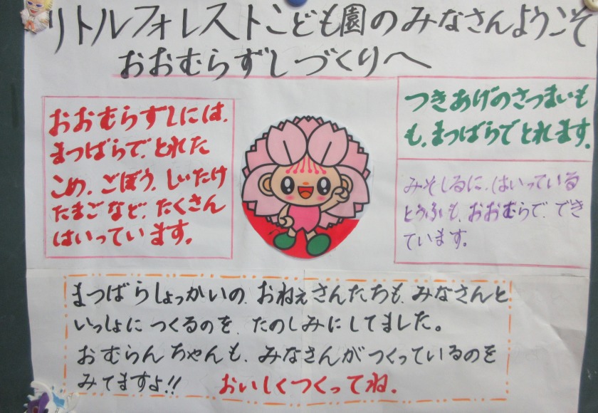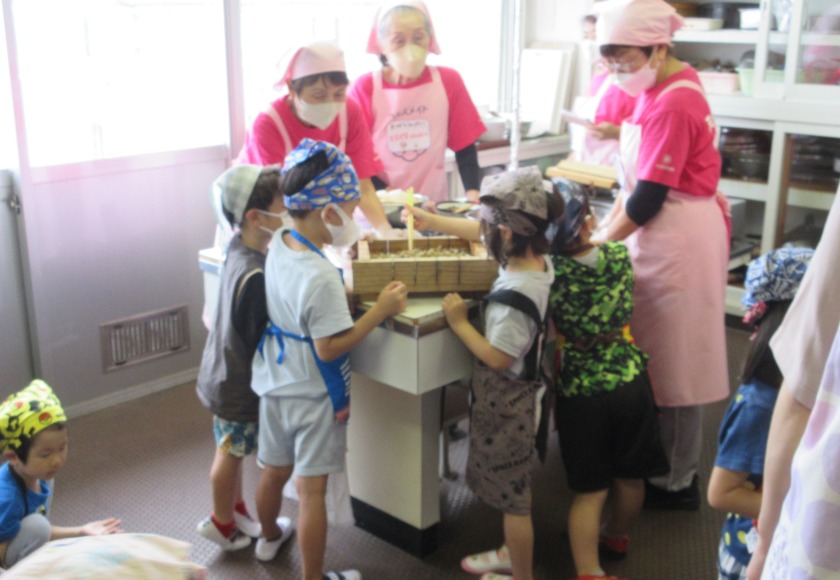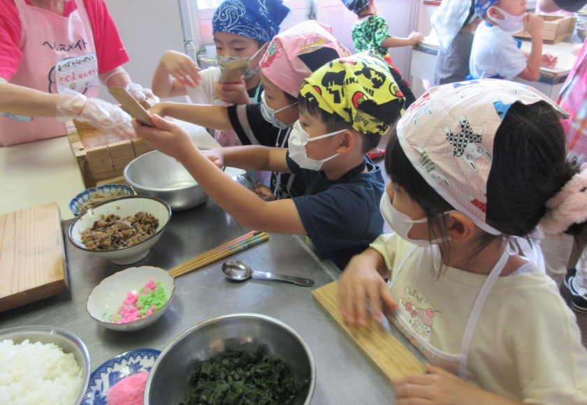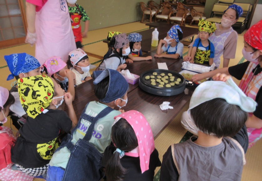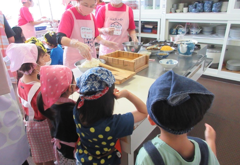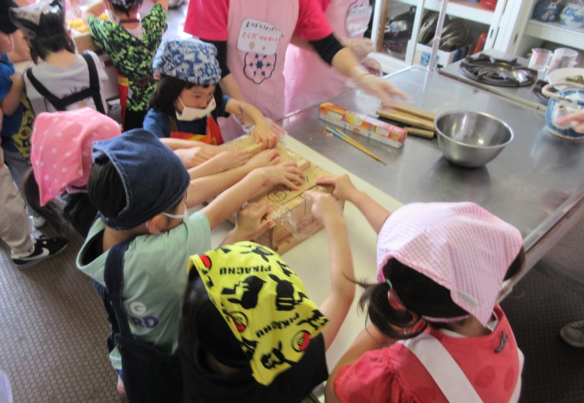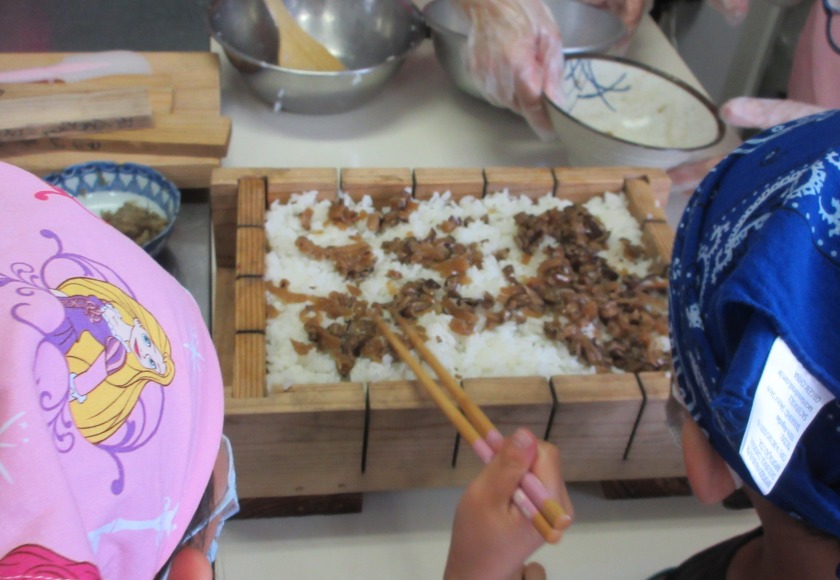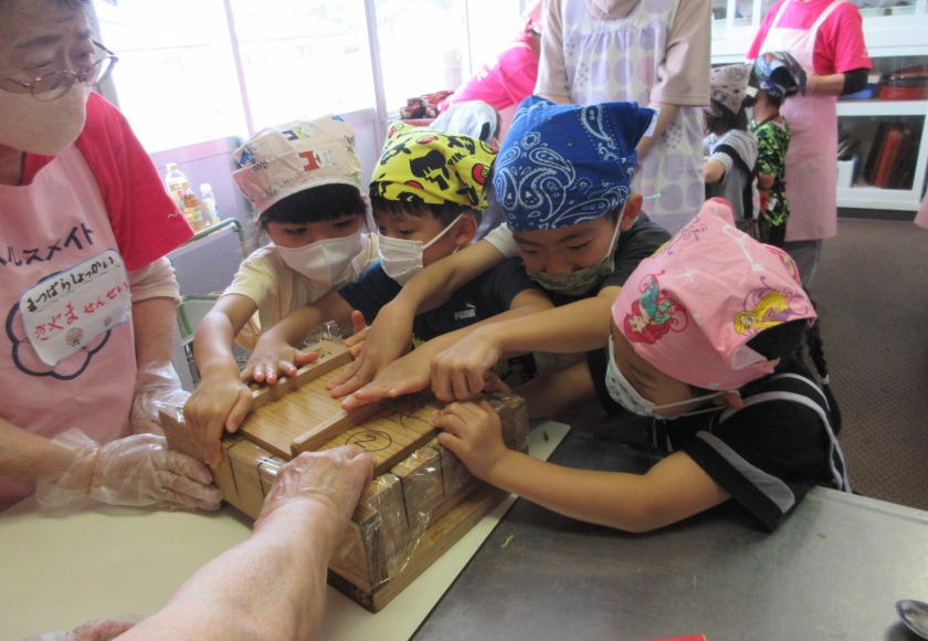 今日は松原の食育改善推進委員の皆さんと年長児さんが、大村の郷土料理「大村寿司」と「つきあげ」を作りました。3班に分かれていろいろ教えていただきながら楽しく作ることができました。ごはんや具材を順番に並べて最後に、みんなで「おいしくなーれ」と言いながら力を込めてぎゅっと押していきました。つきあげ作りはふかしてあるお芋を丸めて平らにしホットプレートで焼いて行きました。焼けてくるといい匂いがしてきて「おいしそう」「早く食べたい」とおなかペコペコの子ども達でした。皆さんと一緒におしゃべりしながらおいしくいただきました。
