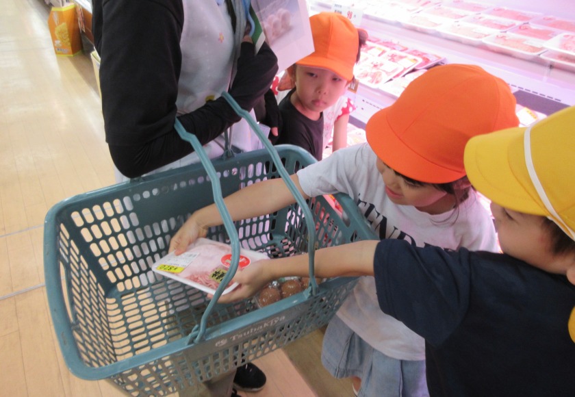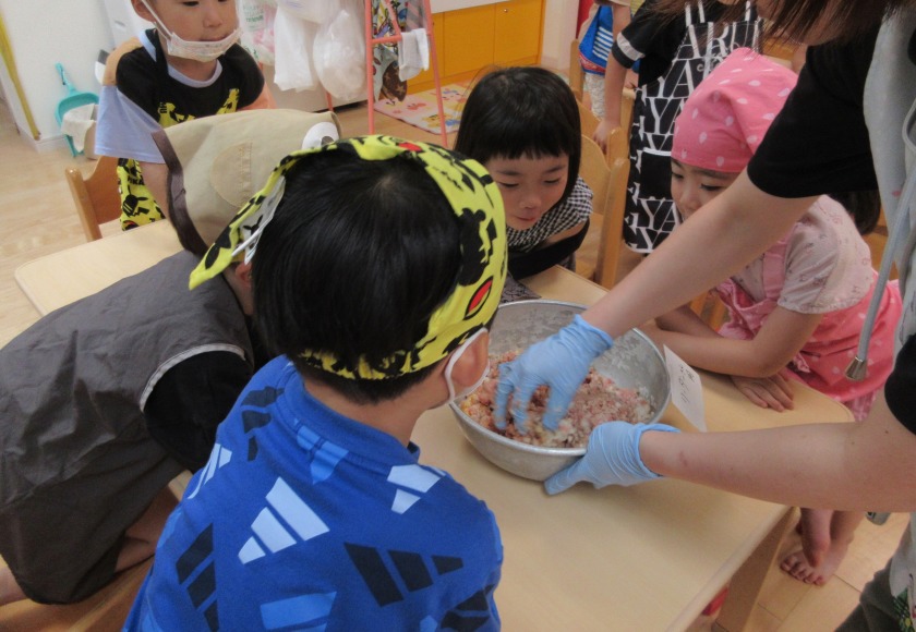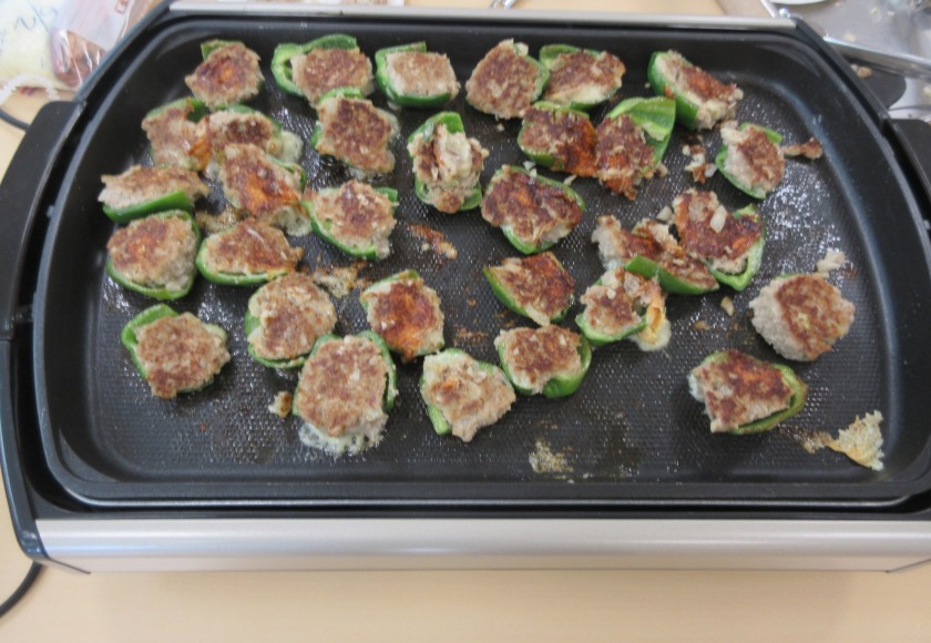 お肉を詰めていきました。中にチーズを入れておいしそうです。ホットプレートに沢山の肉詰めピーマンが並んでおいしそうに焼かれ、「いいにおい」「はやくたべた~い」と焼けるまで待っていた子ども達でした。できあがると「おいしい!!」「おかわり!」とたくさん食べてくれました。自分たちで頑張って作った料理は格別っだったようです。