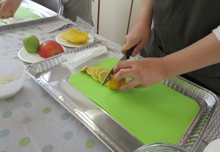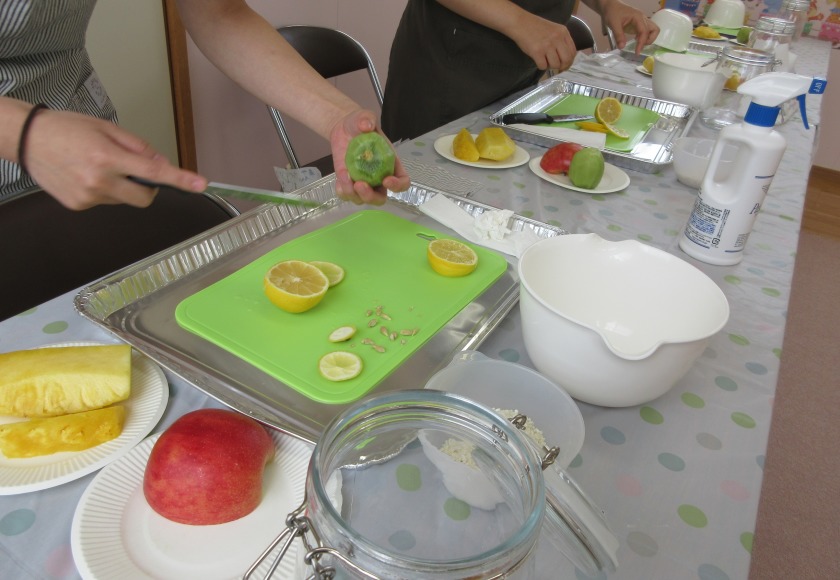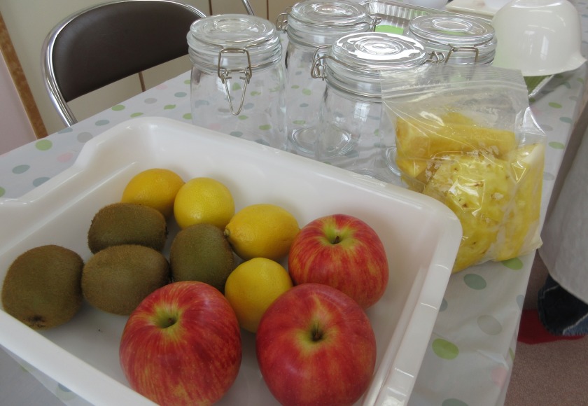パイナップル、りんご、キウイ、レモンを細かく切って、砂糖、麹と順番に瓶に詰めていく作業でしたが、細かく切れば切るほど酵素が沢山出やすいということで皆さん頑張って