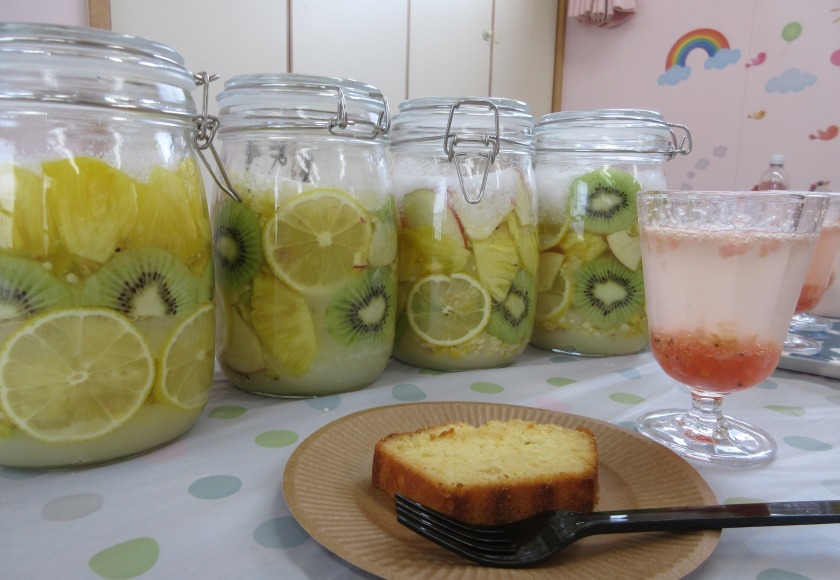 トントントントン切って行きました。1週間ほどで出来上がるということで後は皆さんお家でしっかり毎日混ぜてもらって育ててもらいます。1週間後はおいしいシロップの出来上がりです。今日はレモンのパウンドケーキとルビーキウイのシロップジュースの試食もあって、とてもおいしかったです。また機会があればシロップ作りを行いたいと思います。