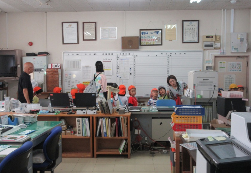 職員室へ入って元気よく挨拶をし、教頭先生に小学校の中を案内してもらいました。